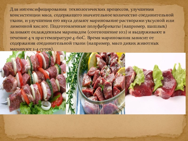 ткани, и улучшения его вкуса делают маринование растворами уксусной или лимонной кислот. Подготовленные полуфабрикаты (например, шашлык) заливают охлажденным маринадом (соотношение 10:1) и выдерживают в течение 4 ч при температуре 4-60С. Время маринования зависит от содержания соединительной ткани (например, мясо диких животных маринуют 1-4 суток).