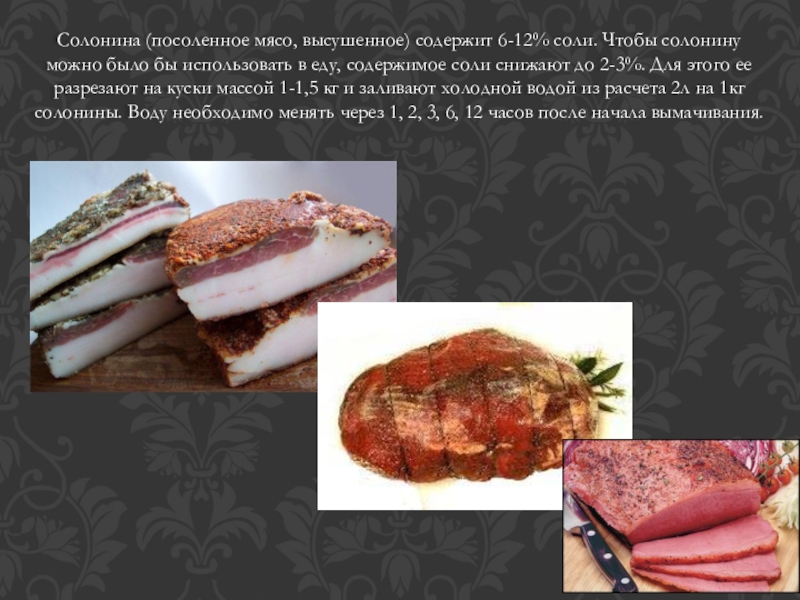 Слайд 24Солонина (посоленное мясо, высушенное) содержит 6-12% соли. Чтобы солонину можно было