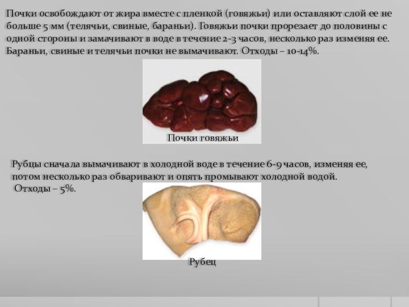 ее не больше 5 мм (телячьи, свиные, бараньи). Говяжьи почки прорезает до половины с одной стороны и замачивают в воде в течение 2-3 часов, несколько раз изменяя ее. Бараньи, свиные и телячьи почки не вымачивают. Отходы – 10-14%.