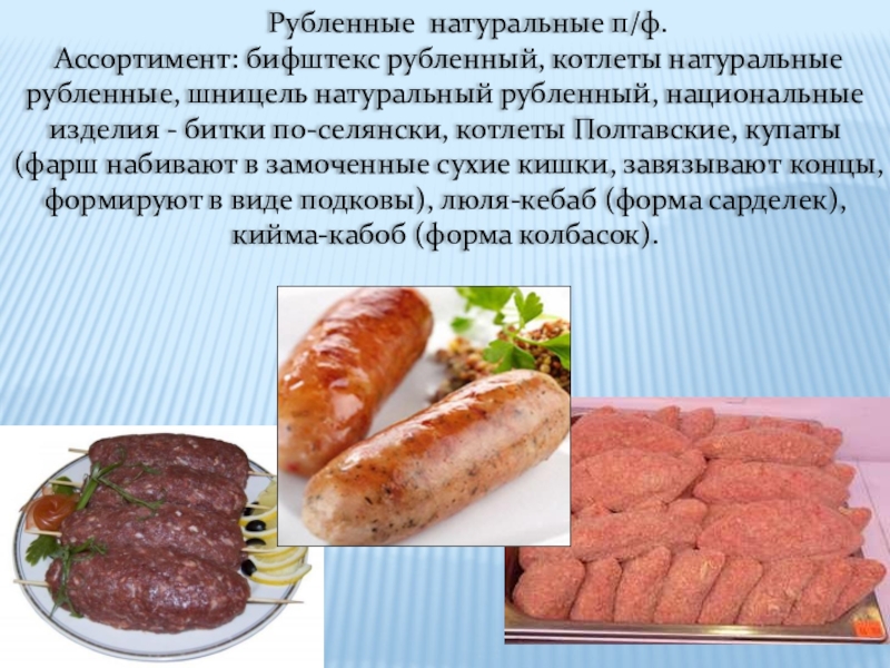 рубленный, национальные изделия - битки по-селянски, котлеты Полтавские, купаты (фарш набивают в замоченные сухие кишки, завязывают концы, формируют в виде подковы), люля-кебаб (форма сарделек), кийма-кабоб (форма колбасок).