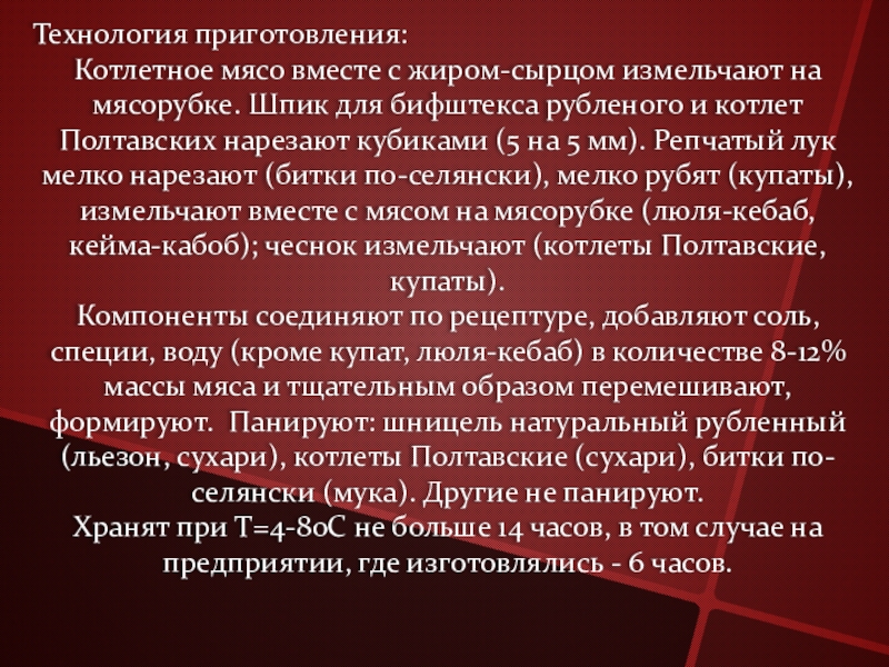 для бифштекса рубленого и котлет Полтавских нарезают кубиками (5 на 5 мм). Репчатый лук мелко нарезают (битки по-селянски), мелко рубят (купаты), измельчают вместе с мясом на мясорубке (люля-кебаб, кейма-кабоб); чеснок измельчают (котлеты Полтавские, купаты).