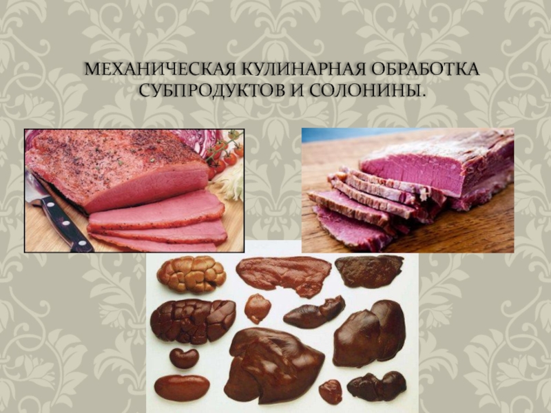 Слайд 20МЕХАНИЧЕСКАЯ КУЛИНАРНАЯ ОБРАБОТКА СУБПРОДУКТОВ И СОЛОНИНЫ.