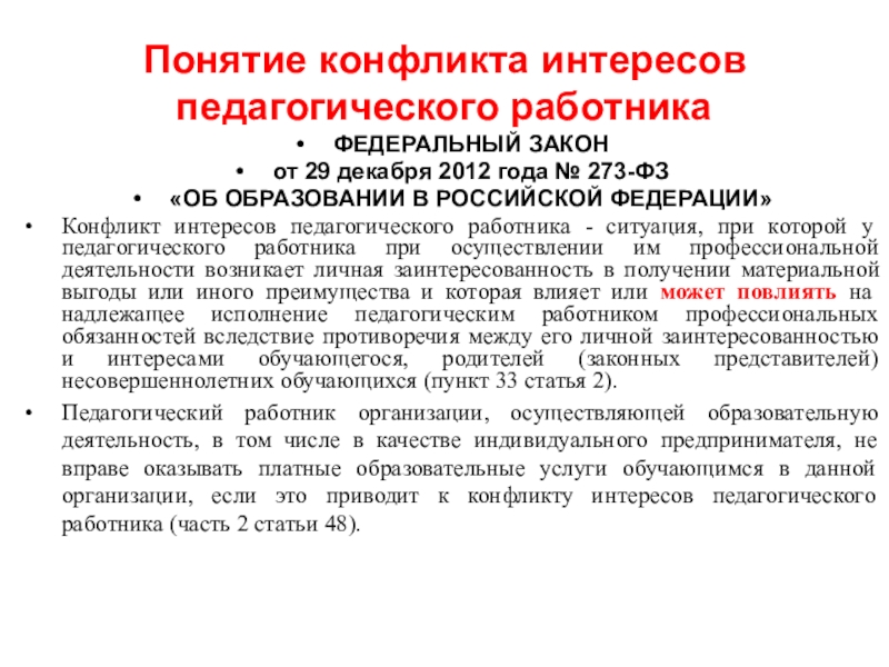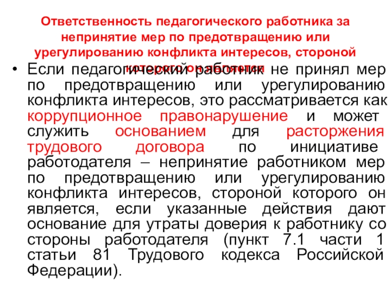 Если педагогический работник не принял мер по предотвращению или урегулированию конфликта интересов, это рассматривается как коррупционное правонарушение и может служить основанием для расторжения трудового договора по инициативе работодателя – непринятие работником мер по предотвращению или урегулированию конфликта интересов, стороной которого он является, если указанные действия дают основание для утраты доверия к работнику со стороны работодателя (пункт 7.1 части 1 статьи 81 Трудового кодекса Российской Федерации).