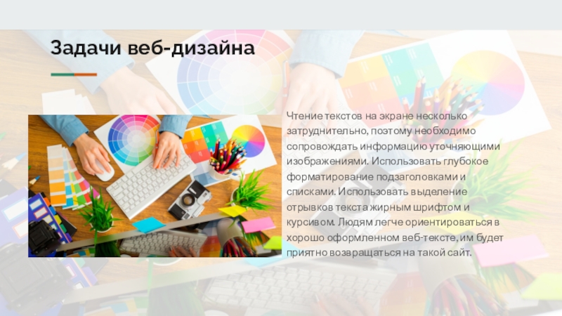 уточняющими изображениями. Использовать глубокое форматирование подзаголовками и списками. Использовать выделение отрывков текста жирным шрифтом и курсивом. Людям легче ориентироваться в хорошо оформленном веб-тексте, им будет приятно возвращаться на такой сайт.