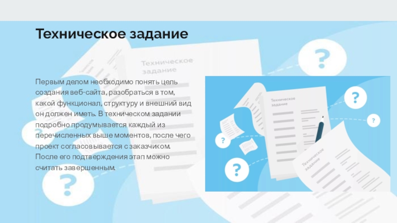 какой функционал, структуру и внешний вид он должен иметь. В техническом задании подробно продумывается каждый из перечисленных выше моментов, после чего проект согласовывается с заказчиком. После его подтверждения этап можно считать завершенным.