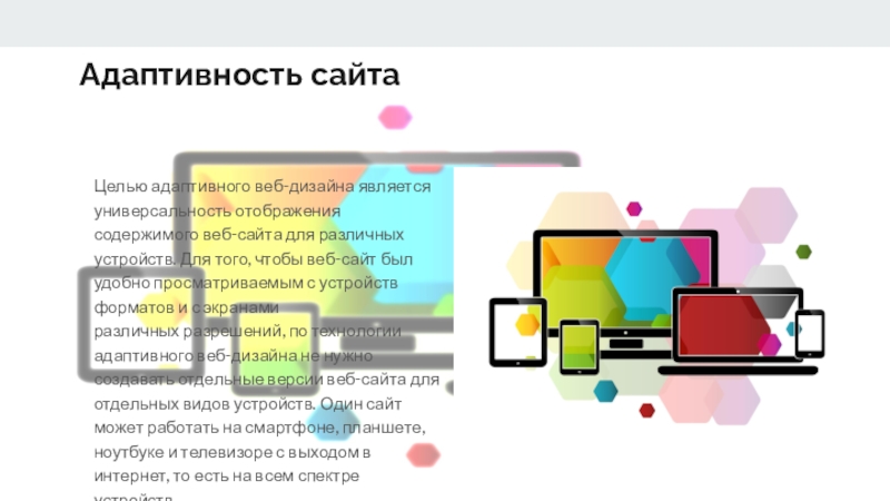 устройств. Для того, чтобы веб-сайт был удобно просматриваемым с устройств форматов и с экранами различных разрешений, по технологии адаптивного веб-дизайна не нужно создавать отдельные версии веб-сайта для отдельных видов устройств. Один сайт может работать на смартфоне, планшете, ноутбуке и телевизоре с выходом в интернет, то есть на всем спектре устройств.