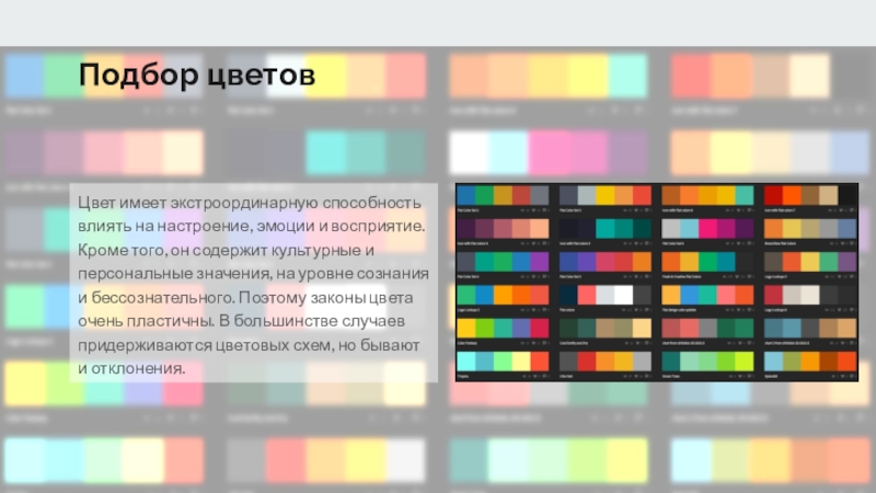 Кроме того, он содержит культурные и персональные значения, на уровне сознания и бессознательного. Поэтому законы цвета очень пластичны. В большинстве случаев придерживаются цветовых схем, но бывают и отклонения.