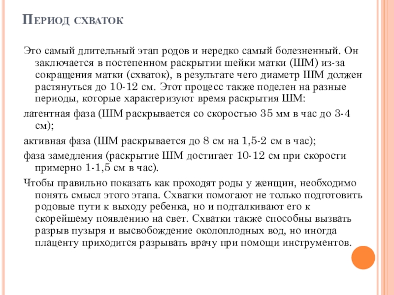заключается в постепенном раскрытии шейки матки (ШМ) из-за сокращения матки (схваток), в результате чего диаметр ШМ должен растянуться до 10-12 см. Этот процесс также поделен на разные периоды, которые характеризуют время раскрытия ШМ: