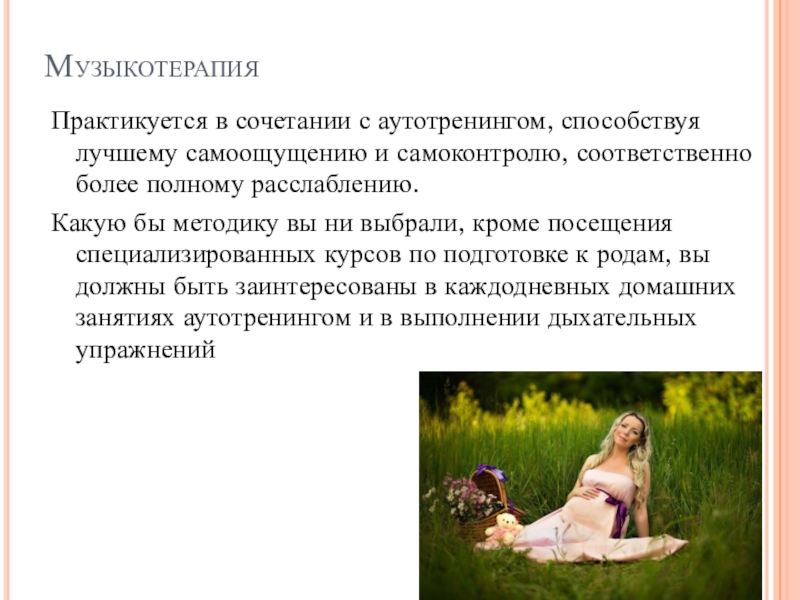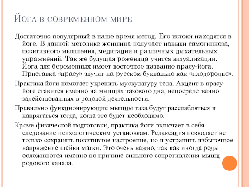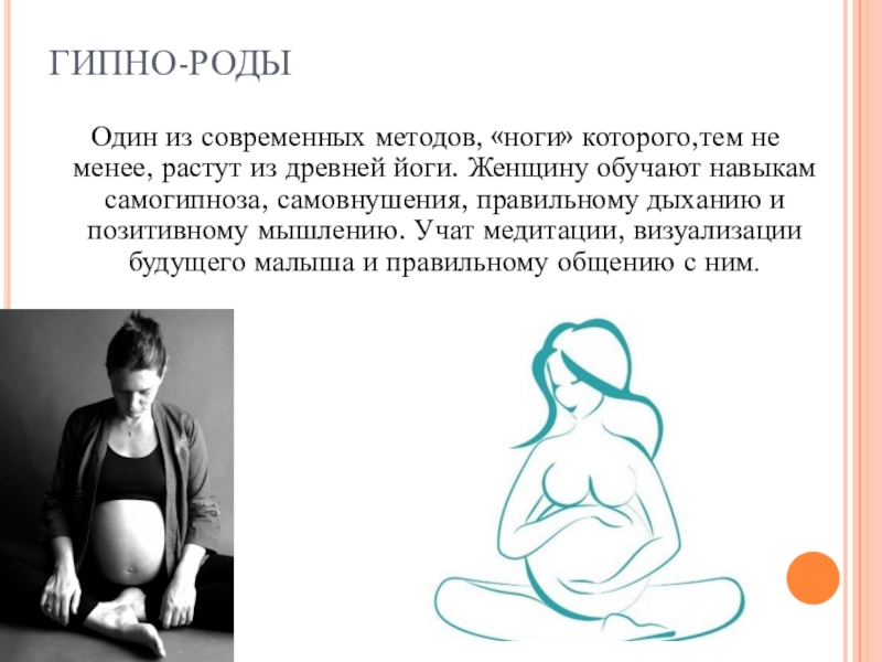 древней йоги. Женщину обучают навыкам самогипноза, самовнушения, правильному дыханию и позитивному мышлению. Учат медитации, визуализации будущего малыша и правильному общению с ним.