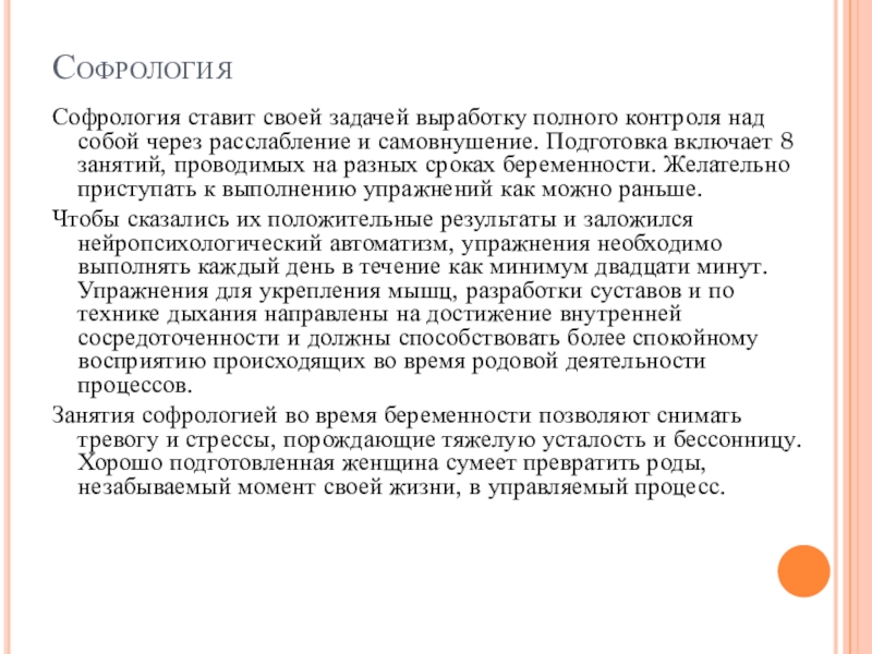 Занятия софрологией во время беременности позволяют снимать тревогу и стрессы, порождающие тяжелую усталость и бессонницу. Хорошо подготовленная женщина сумеет превратить роды, незабываемый момент своей жизни, в управляемый процесс.