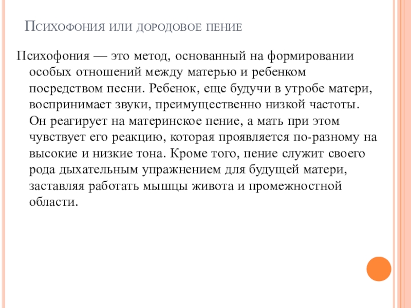 отношений между матерью и ребенком посредством песни. Ребенок, еще будучи в утробе матери, воспринимает звуки, преимущественно низкой частоты. Он реагирует на материнское пение, а мать при этом чувствует его реакцию, которая проявляется по-разному на высокие и низкие тона. Кроме того, пение служит своего рода дыхательным упражнением для будущей матери, заставляя работать мышцы живота и промежностной области.