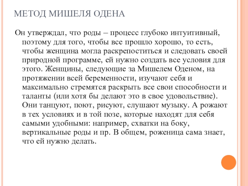 для того, чтобы все прошло хорошо, то есть, чтобы женщина могла раскрепоститься и следовать своей природной программе, ей нужно создать все условия для этого. Женщины, следующие за Мишелем Оденом, на протяжении всей беременности, изучают себя и максимально стремятся раскрыть все свои способности и таланты (или хотя бы делают это в свое удовольствие). Они танцуют, поют, рисуют, слушают музыку. А рожают в тех условиях и в той позе, которые находят для себя самыми удобными: например, схватки на боку, вертикальные роды и пр. В общем, роженица сама знает, что ей нужно делать.
