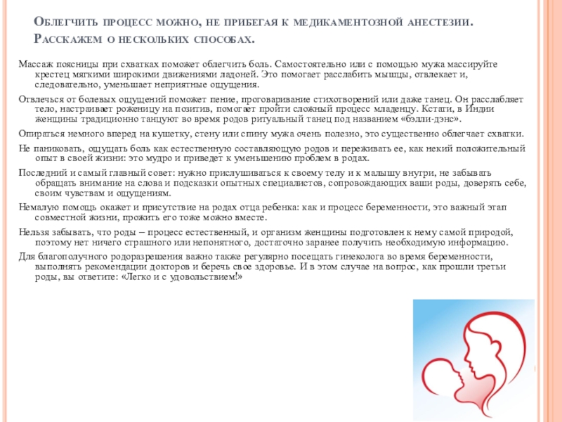 Слайд 29Облегчить процесс можно, не прибегая к медикаментозной анестезии. Расскажем о нескольких