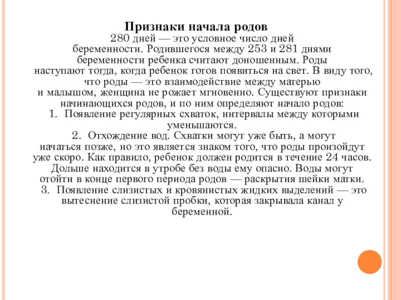 днями беременности ребенка считают доношенным. Роды наступают тогда, когда ребенок готов появиться на свет. В виду того, что роды — это взаимодействие между матерью и малышом, женщина не рожает мгновенно. Существуют признаки начинающихся родов, и по ним определяют начало родов: