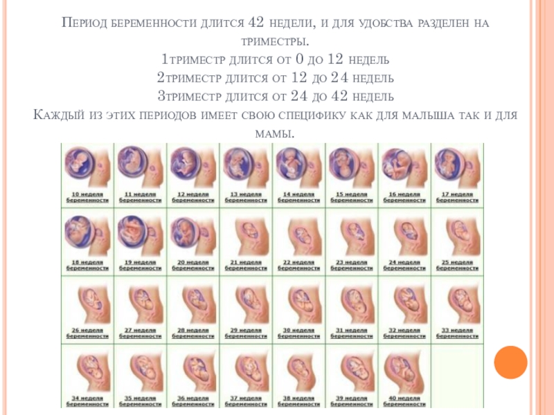 Слайд 4Период беременности длится 42 недели, и для удобства разделен на триместры.