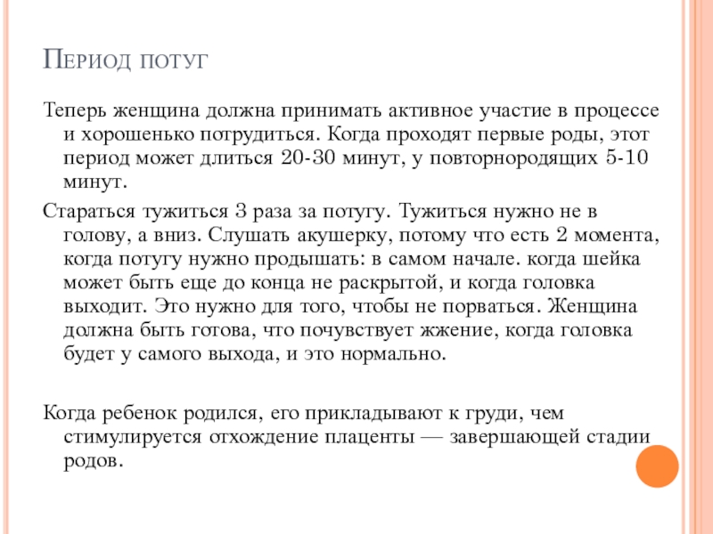потрудиться. Когда проходят первые роды, этот период может длиться 20-30 минут, у повторнородящих 5-10 минут.