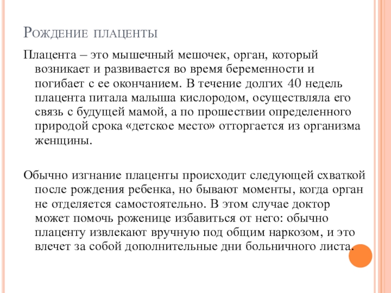 Обычно изгнание плаценты происходит следующей схваткой после рождения ребенка, но бывают моменты, когда орган не отделяется самостоятельно. В этом случае доктор может помочь роженице избавиться от него: обычно плаценту извлекают вручную под общим наркозом, и это влечет за собой дополнительные дни больничного листа.