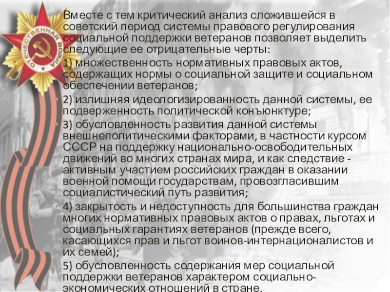 регулирования социальной поддержки ветеранов позволяет выделить следующие ее отрицательные черты: