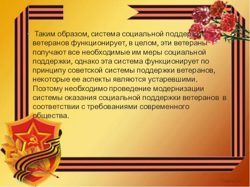 ветераны получают все необходимые им меры социальной поддержки, однако эта система функционирует по принципу советской системы поддержки ветеранов, некоторые ее аспекты являются устаревшими. Поэтому необходимо проведение модернизации системы оказания социальной поддержки ветеранов в соответствии с требованиями современного общества.