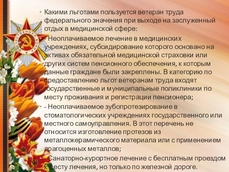 Слайд 9Какими льготами пользуется ветеран труда федерального значения при выходе на заслуженный