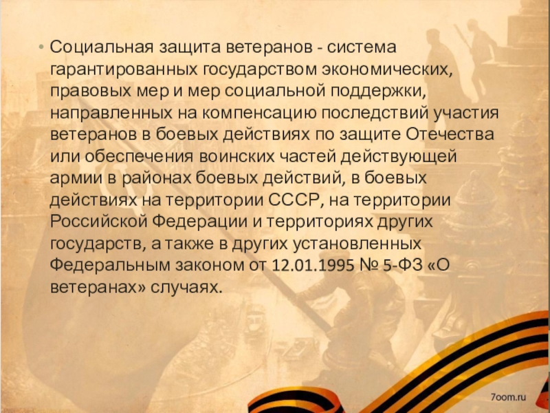 Слайд 5Социальная защита ветеранов - система гарантированных государством экономических, правовых мер и