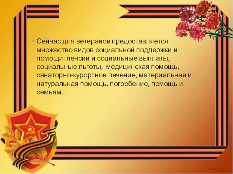 Слайд 13Сейчас для ветеранов предоставляется множество видов социальной поддержки и помощи: пенсии