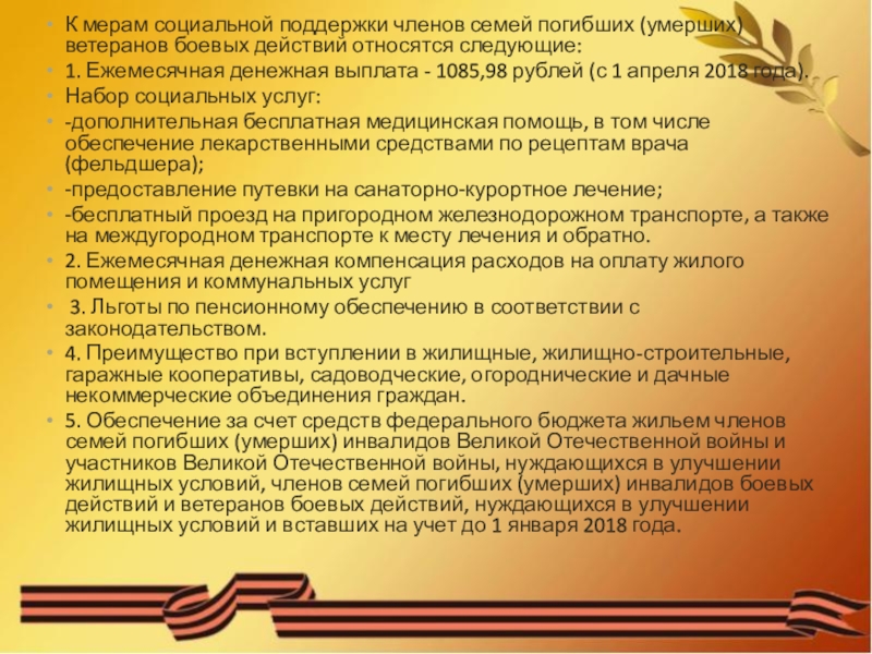 Слайд 11К мерам социальной поддержки членов семей погибших (умерших) ветеранов боевых действий