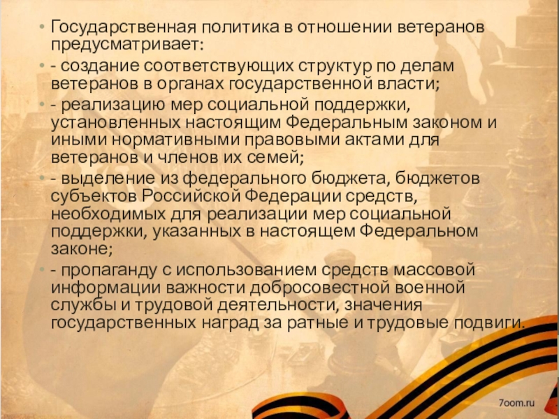Слайд 7Государственная политика в отношении ветеранов предусматривает: