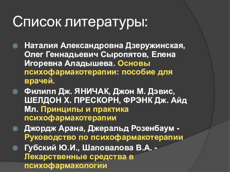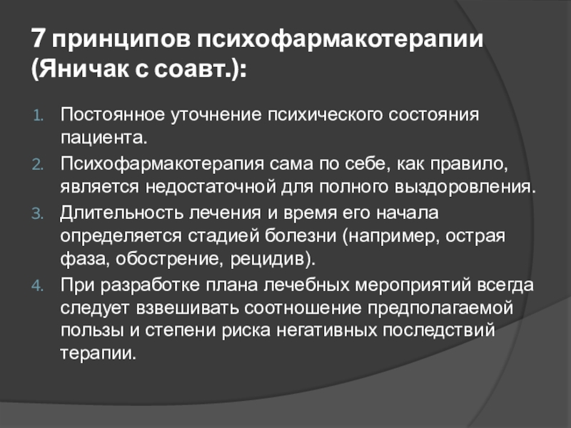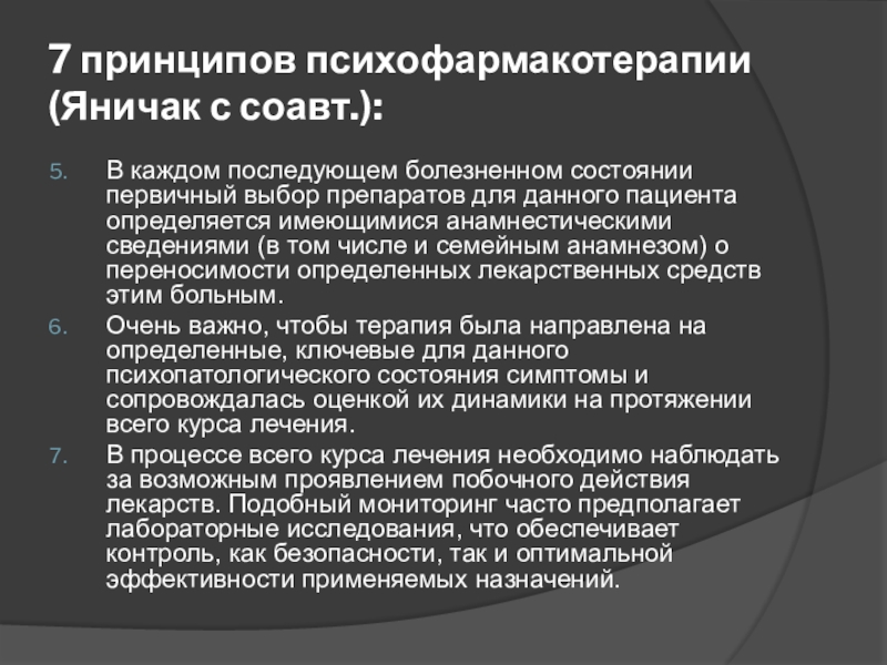 Слайд 457 принципов психофармакотерапии (Яничак с соавт.):