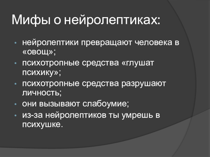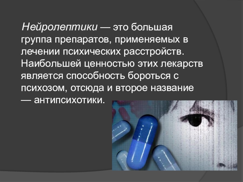 Слайд 11Нейролептики — это большая группа препаратов, применяемых в лечении психических расстройств.