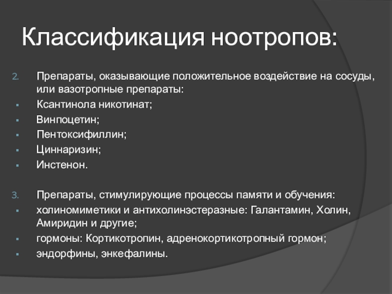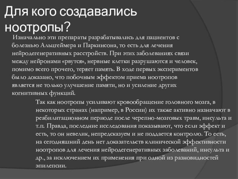 Группа ноотропных препаратов начала формироваться в 1963 г., когда у некоторых производных ГАМК были выявлены свойства активировать когнитивные процессы.