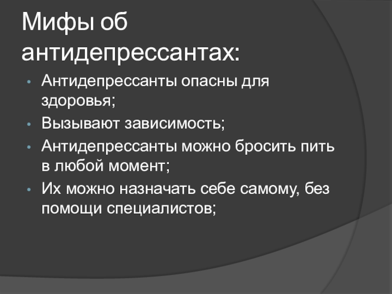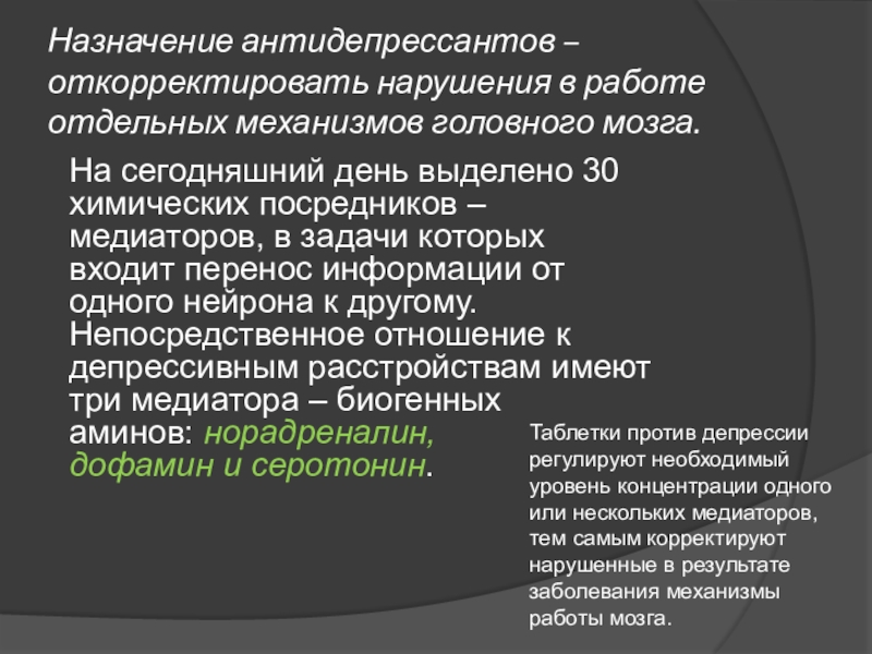 Слайд 5История антидепрессантов начинается с 1957 г. с обнаружения антидепрессивных свойств у некоторых противотуберкулезных