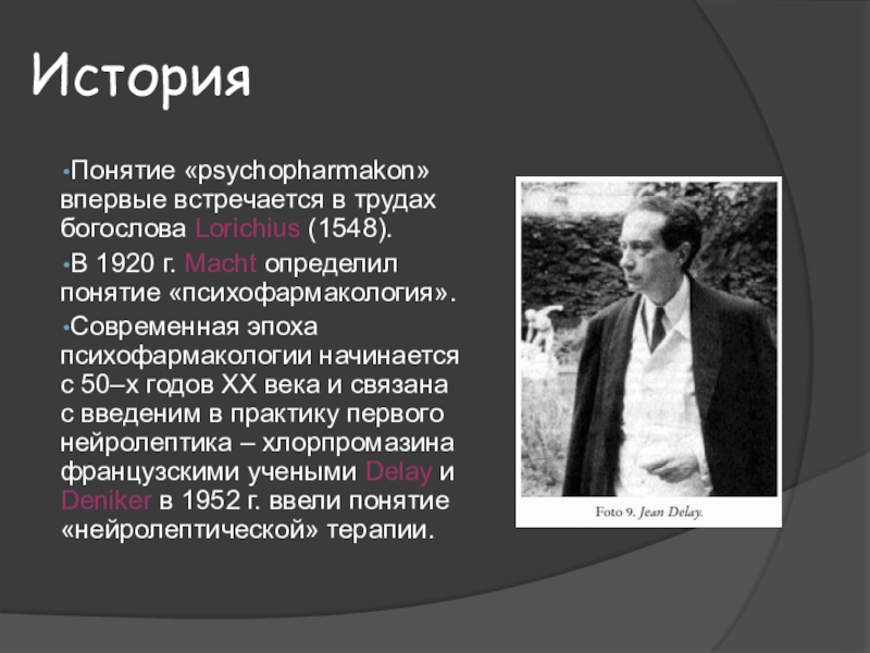 Современная эпоха психофармакологии начинается с 50–х годов ХХ века и связана с введеним в практику первого нейролептика – хлорпромазина французскими учеными Delay и Deniker в 1952 г. ввели понятие «нейролептической» терапии.