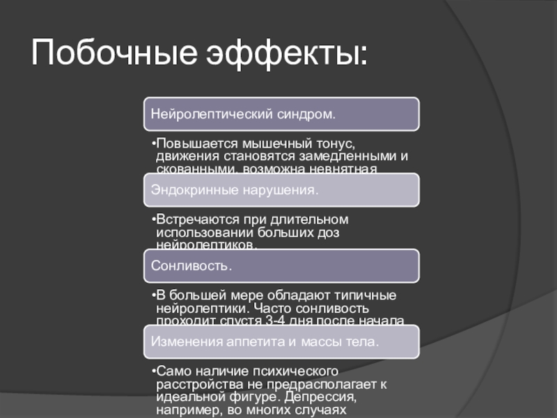 Соматические побочные эффекты весьма значительны у первых представителей этого класса веществ – производных фенотиазина. Неврологические осложнения – у производных бутирофенона.
