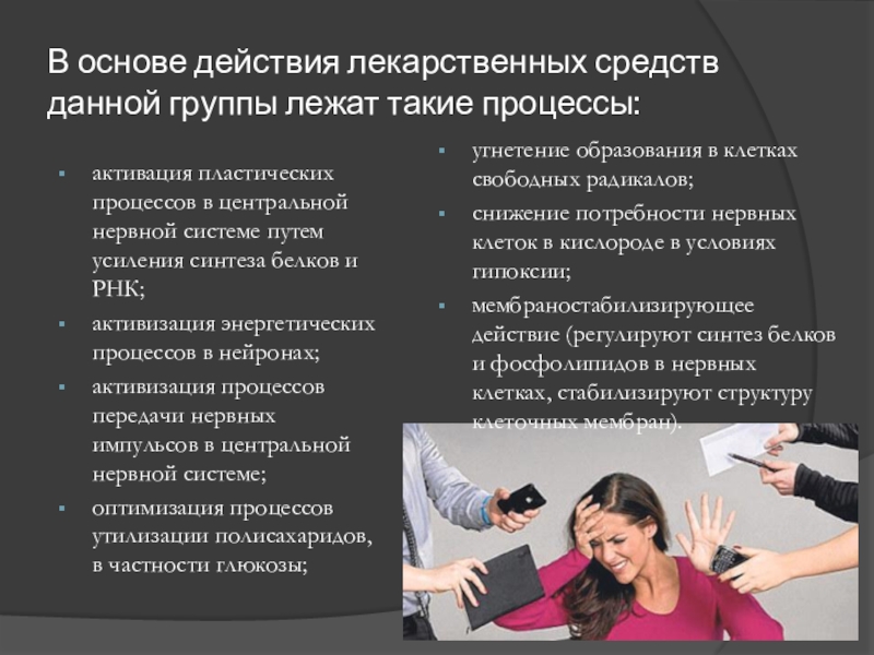 состояния психомоторного возбуждения, бред, галлюцинации и другие проявления психозов. По химическому строению это различные препараты, имеющие свой спектр психотропной активности и побочных эффектов.