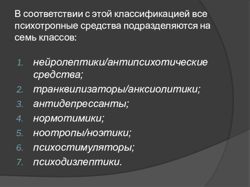 Слайд 10В соответствии с этой классификацией все психотропные средства подразделяются на семь