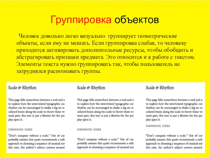 объекты, если ему не мешать. Если группировка слабая, то человеку приходится активировать дополнительные ресурсы, чтобы обобщить и абстрагировать признаки предмета. Это относится и к работе с текстом. Элементы текста нужно группировать так, чтобы пользователь не затруднялся распознавать группы.