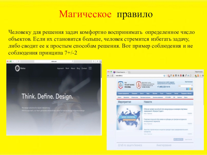 становится больше, человек стремится избегать задачу, либо сводит ее к простым способам решения. Вот пример соблюдения и не соблюдения принципа 7+/-2