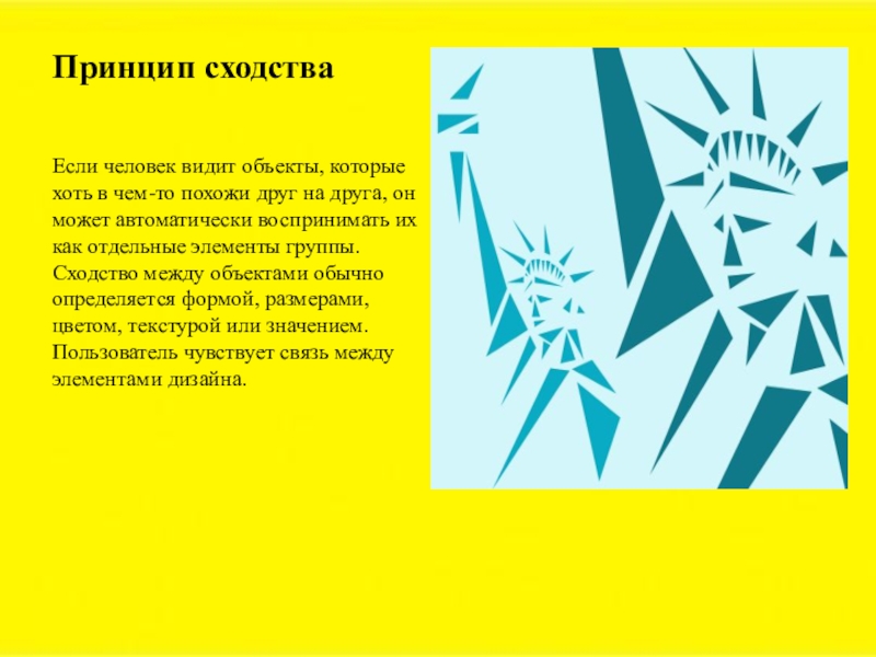 друг на друга, он может автоматически воспринимать их как отдельные элементы группы. Сходство между объектами обычно определяется формой, размерами, цветом, текстурой или значением. Пользователь чувствует связь между элементами дизайна.