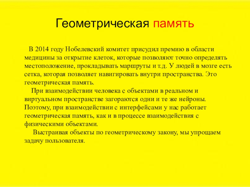При взаимодействии человека с объектами в реальном и виртуальном пространстве загораются одни и те же нейроны. Поэтому, при взаимодействии с интерфейсами у нас работает геометрическая память, как и в процессе взаимодействия с физическими объектами.