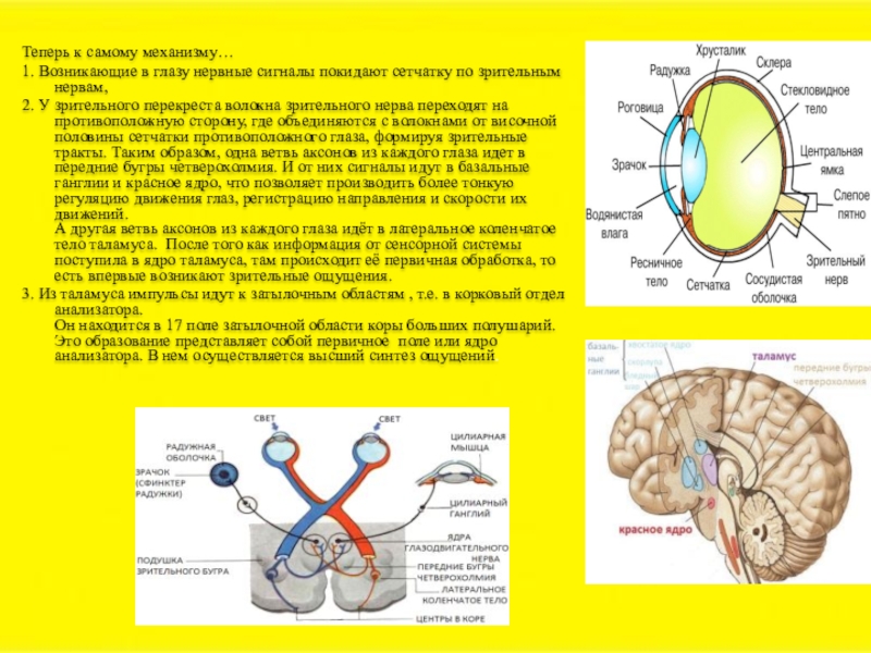 2. У зрительного перекреста волокна зрительного нерва переходят на противоположную сторону, где объединяются с волокнами от височной половины сетчатки противоположного глаза, формируя зрительные тракты. Таким образом, одна ветвь аксонов из каждого глаза идет в передние бугры четверохолмия. И от них сигналы идут в базальные ганглии и красное ядро, что позволяет производить более тонкую регуляцию движения глаз, регистрацию направления и скорости их движений.