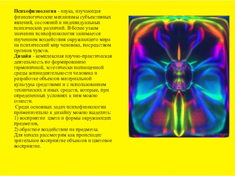Среди основных задач психофизиологии применительно к дизайну можно выделить: 1) восприятие цвета и формы окружающих предметов,