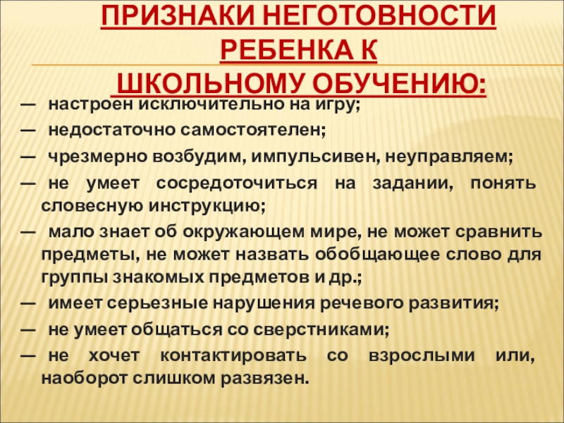 Слайд 9ПРИЗНАКИ НЕГОТОВНОСТИ РЕБЕНКА К