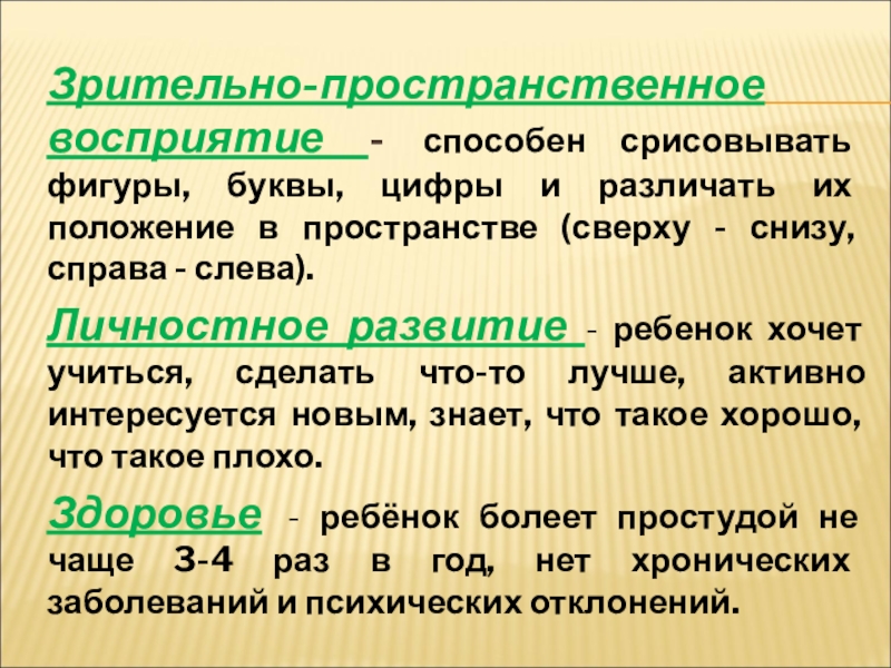 Слайд 8Зрительно-пространственное восприятие - способен срисовывать фигуры, буквы, цифры и различать их