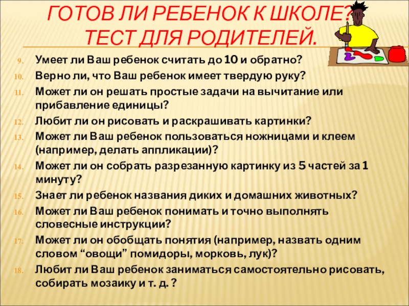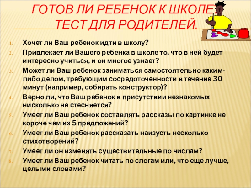Слайд 13ГОТОВ ЛИ РЕБЕНОК К ШКОЛЕ?