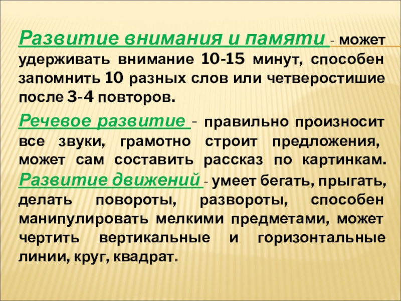 Слайд 7Развитие внимания и памяти - может удерживать внимание 10-15 минут, способен