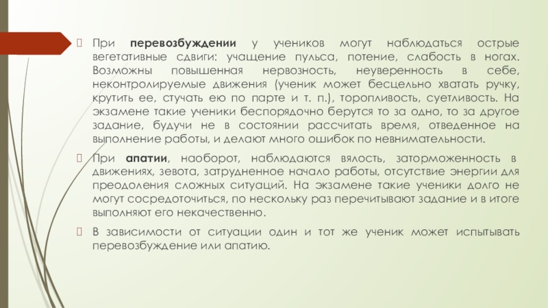 Слайд 5При перевозбуждении у учеников могут наблюдаться острые вегетативные сдвиги: учащение пульса,