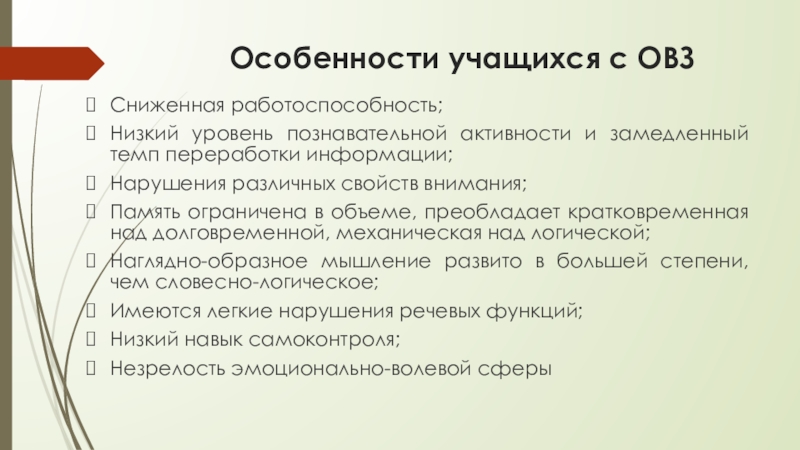 Особенности учащихся с ОВЗСниженная работоспособность; Низкий уровень познавательной активности и замедленный темп переработки информации; Нарушения различных свойств внимания;Память ограничена в объеме, преобладает кратковременная над долговременной, механическая над логической;Наглядно-образное мышление развито в большей степени, чем словесно-логическое;Имеются