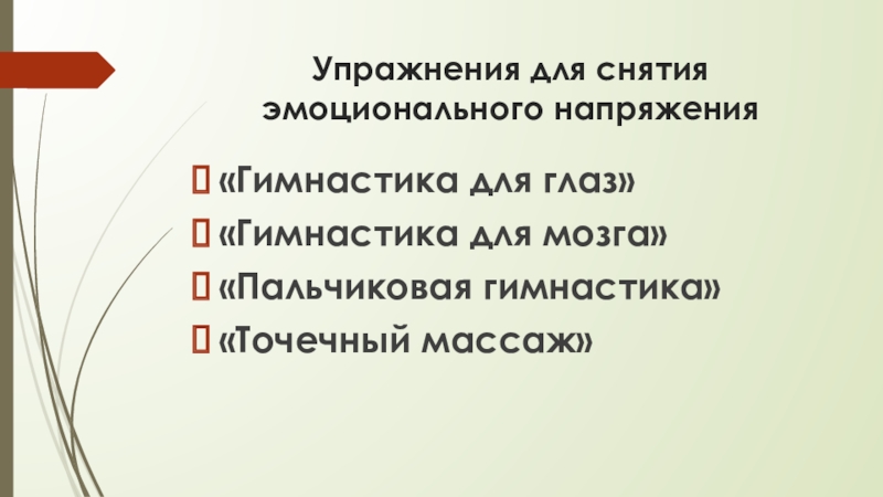 Упражнения для снятия эмоционального напряжения«Гимнастика для глаз»«Гимнастика для мозга»«Пальчиковая гимнастика»«Точечный массаж»