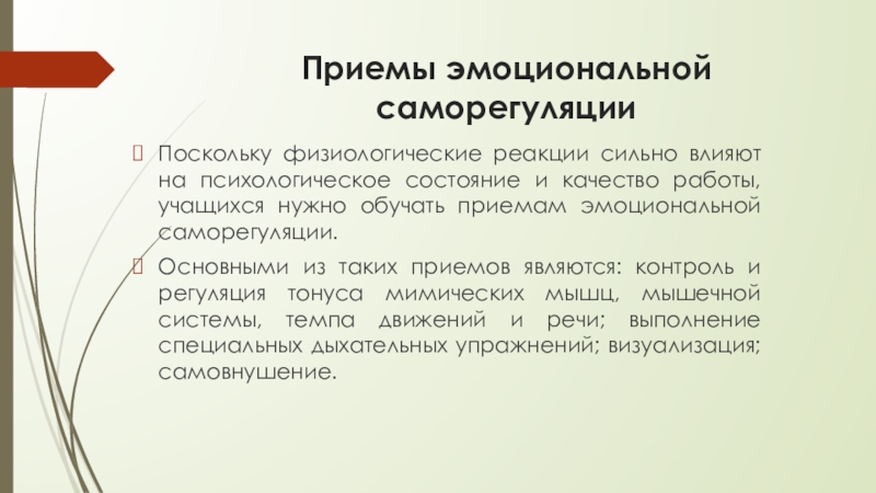 Приемы эмоциональной саморегуляцииПоскольку физиологические реакции сильно влияют на психологическое состояние и качество работы, учащихся нужно обучать приемам